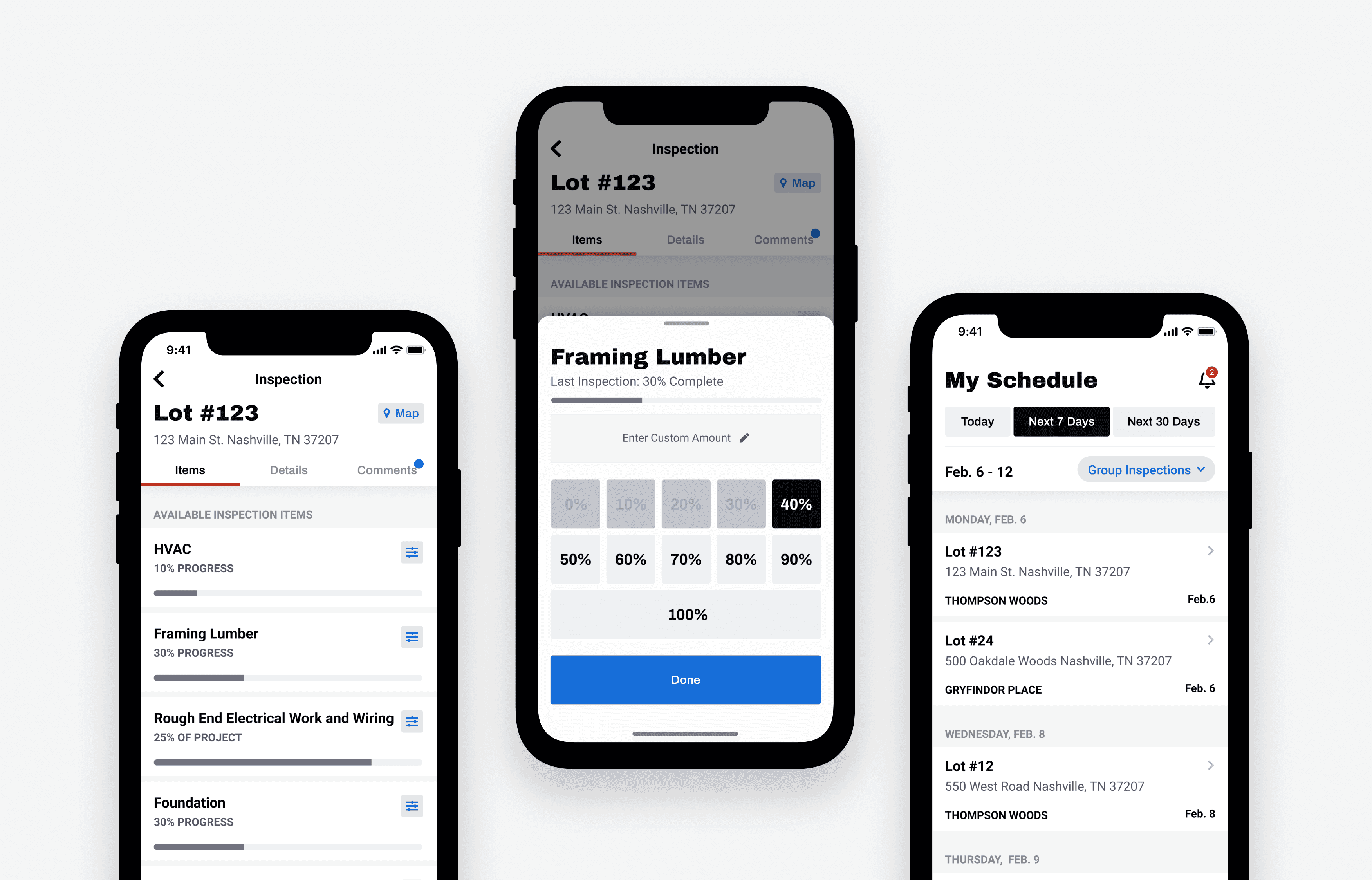 Individual view for today, the next 7 days, and the next 30 days gave an inspector a full view of their assignments with the ability to group by subdivision and zipcode. This provided the info for more intelligent route planning to knock out all upcoming inspections in a given area.
