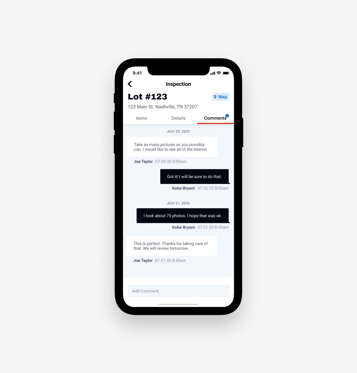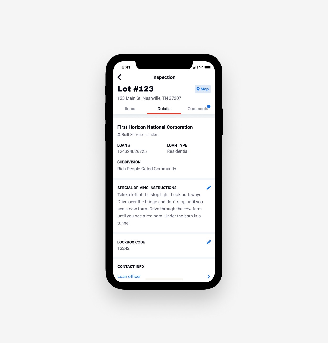 Adding a details section with easily accessible comments and contact information from the Built project within each inspection gave inspectors the information they needed to troubleshoot issues with the lender or borrower while on the job.